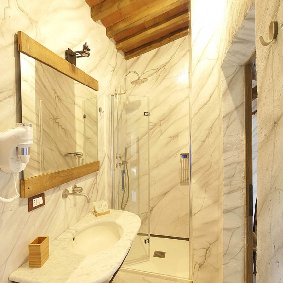 Ein heller Raum, der an die Pracht und das Ausmaß der klassischen Periode erinnert. Ein über dem Bett angebrachtes Flachrelief erzählt die Geschichte einer Venus, die aus unserem Kurort gekommen sein könnte. Es ist das Werk des Künstlers Fabio Graziani, der eine Kopie des Ludovisi-Throns vorschlägt. Die Wände sind mit einem Trompe l’oeil verziert, das an den Glanz des weißen statuarischen Marmors von Carrara erinnert, einem historischen Material, das seit der Antike für die Herstellung von Skulpturen und Kunstwerken verwendet wurde und mit dem die Badezimmereinrichtungen und der Bodenbelag hergestellt wurden. Die Einrichtung, wie auch das Doppelbett, sind Einzelstücke, die von Hand aus recycelten Materialien aus unserem Nachlass hergestellt wurden.