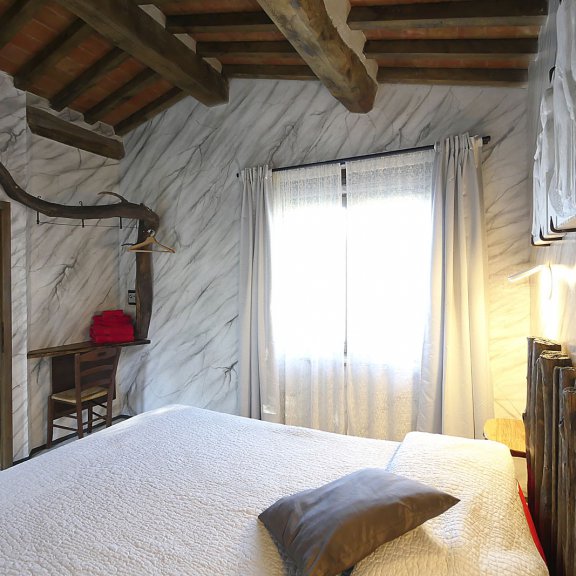Das Zimmer befindet sich im ersten Stock und bietet einen Blick über die Olivenhaine und das Tal von Pian delle Vigne bis hin zu den Colline Metallifere. Es verfügt über eine Terrasse, die die gleiche Aussicht genießt und auch auf die Wälder des Parks Poggio Neri blickt.