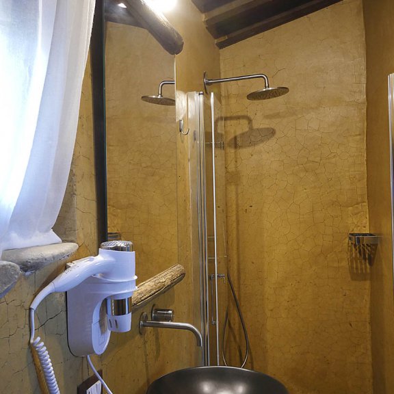 Es verfügt über ein Doppelbett und ein Einzelbett und zeichnet sich durch einen handgefertigten Terrakotta-Fußboden aus, der an die typischen etruskischen Farben erinnert, wobei die Farbtöne von Terrakotta bis zu Dunkelgrau reichen. Die Badezimmerarmaturen hingegen sind chromatisch von „bucchero“ inspiriert, einer Art schwarzer und polierter Keramik, die von den Etruskern zur Herstellung von Vasen hergestellt wurde.