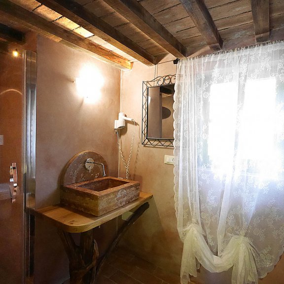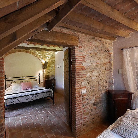 Über unser Territorium und unsere Tradition spricht der Saal der Erinnerungen, der sich wie eine Schatztruhe jenseits einer kleinen Loggia öffnet und typische toskanische Möbel aus Holz oder kunstvoll geschmiedeten Schmiedeeisen bewahrt. Das Zimmer kann zwei oder drei Personen beherbergen: Zusätzlich zu einem Doppelbett im Hauptraum gibt es in einem zweiten Zimmer ein Einzelbett.