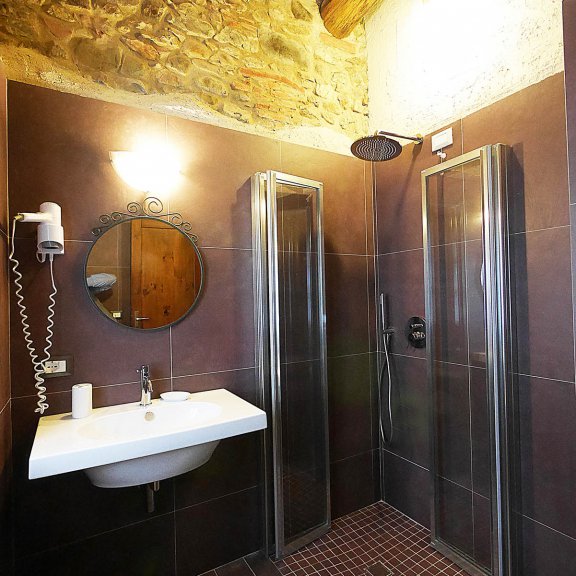 On the eastern side of the main farmhouse La Cerreta, there is “la Cantina”(Cellar room), a room framed by a romantic pergola of climbing roses and a splendid view of the Pian delle Vigne valley. Wine-colored fabrics, stone walls and oak parquet are in harmony with the surrounding environment and evoke the world of harvest and wine, produced on site according to the principles of biodynamics.