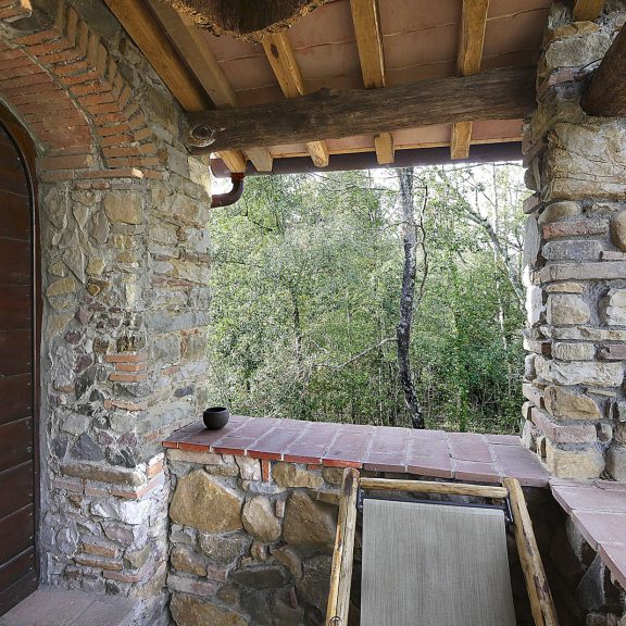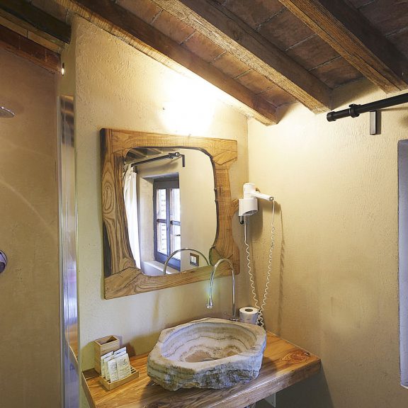 Characterizing elements are the natural wood floor and the bed, a unique piece made with native chestnut trunks. The bathroom has a crystal shower cabin with an onyx sink.